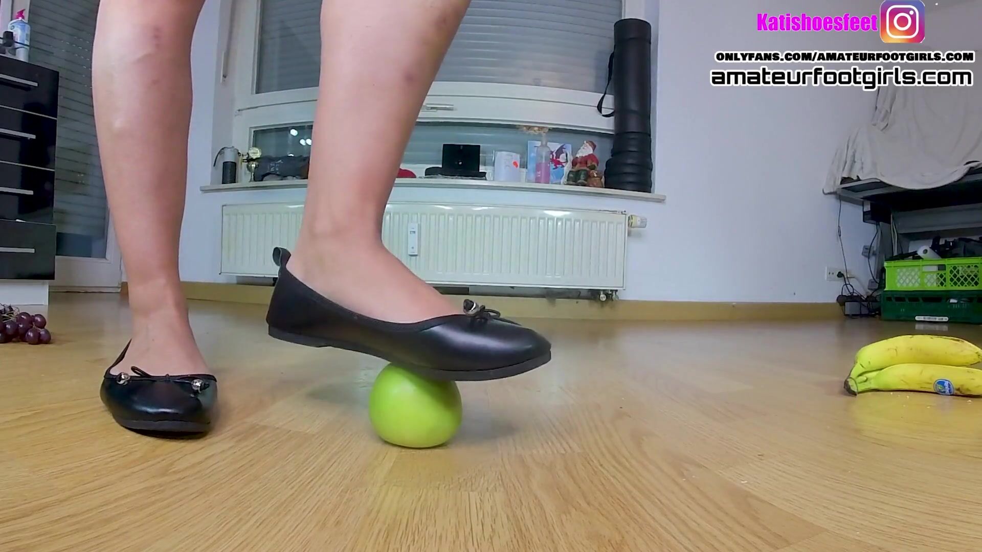 Here Kati is crushing with high heels, ballerinas and barefoot Feet a hamburger and fruit